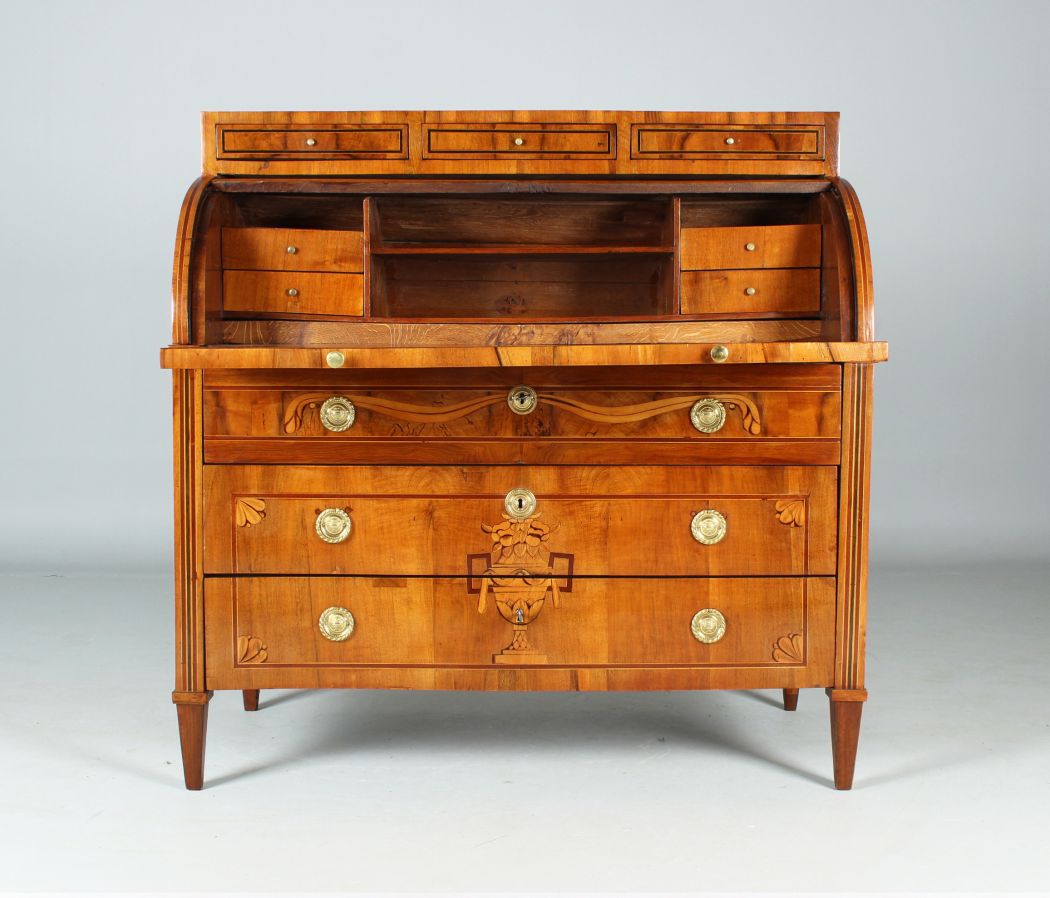 Bei dem hier vorgestellten Möbelstück handelt es sich um einen Zylindersekretär aus der Werkstatt von Philipp Ferdinand Ludwig Bartscher (1749-1823) in Rietberg. Entstanden ist der Sekretär im deutschen Klassizismus um 1795.